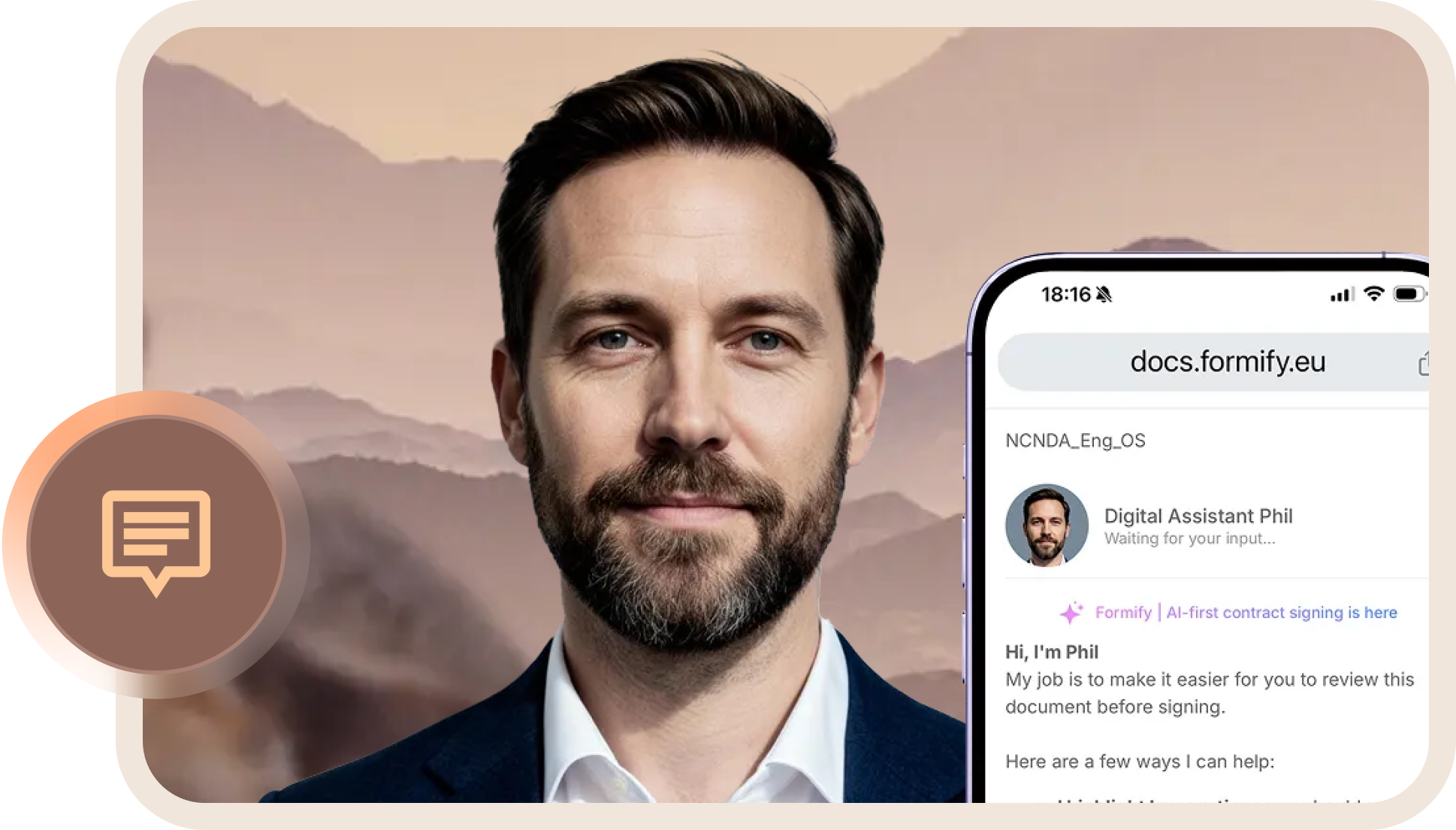 Formify helps your international buyers and sellers understand what they are signing, with an AI assistant inside the e-signing invite, translation and simple explanations, 24/7.